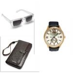 Stylish 3-in-1 combo: silver & gold watch, black leather wallet, and white sunglasses — all at a budget-friendly price. Perfect for daily use or gifting!