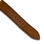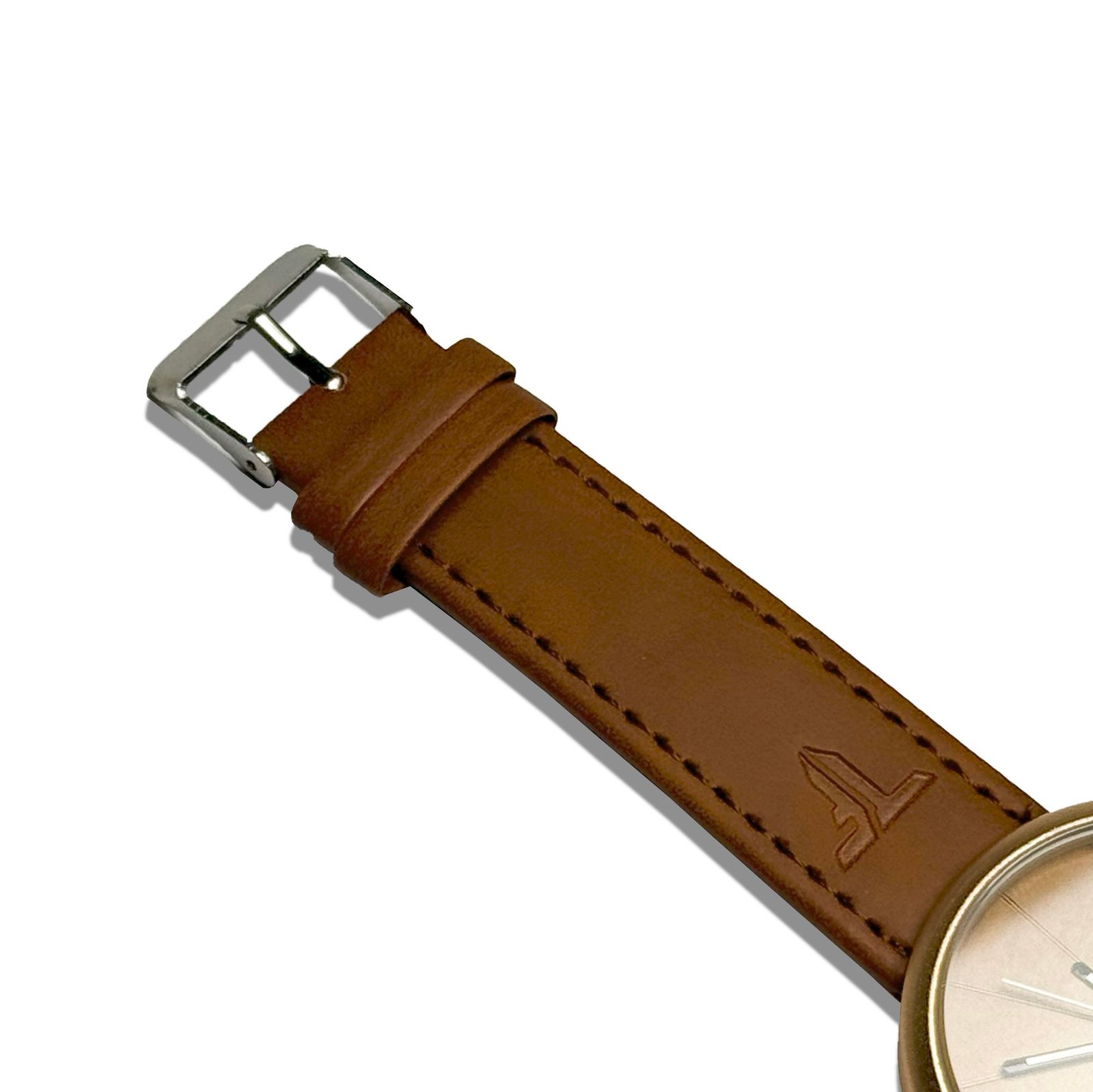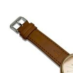 The dark brown leather strap perfectly complements the dial, adding a touch of richness and warmth to the overall design. Made from premium leather, the strap is not only durable but also comfortable, providing a secure and stylish fit for everyday wear. Its deep brown hue contrasts beautifully with the light tones of the dial, offering a striking yet balanced look.